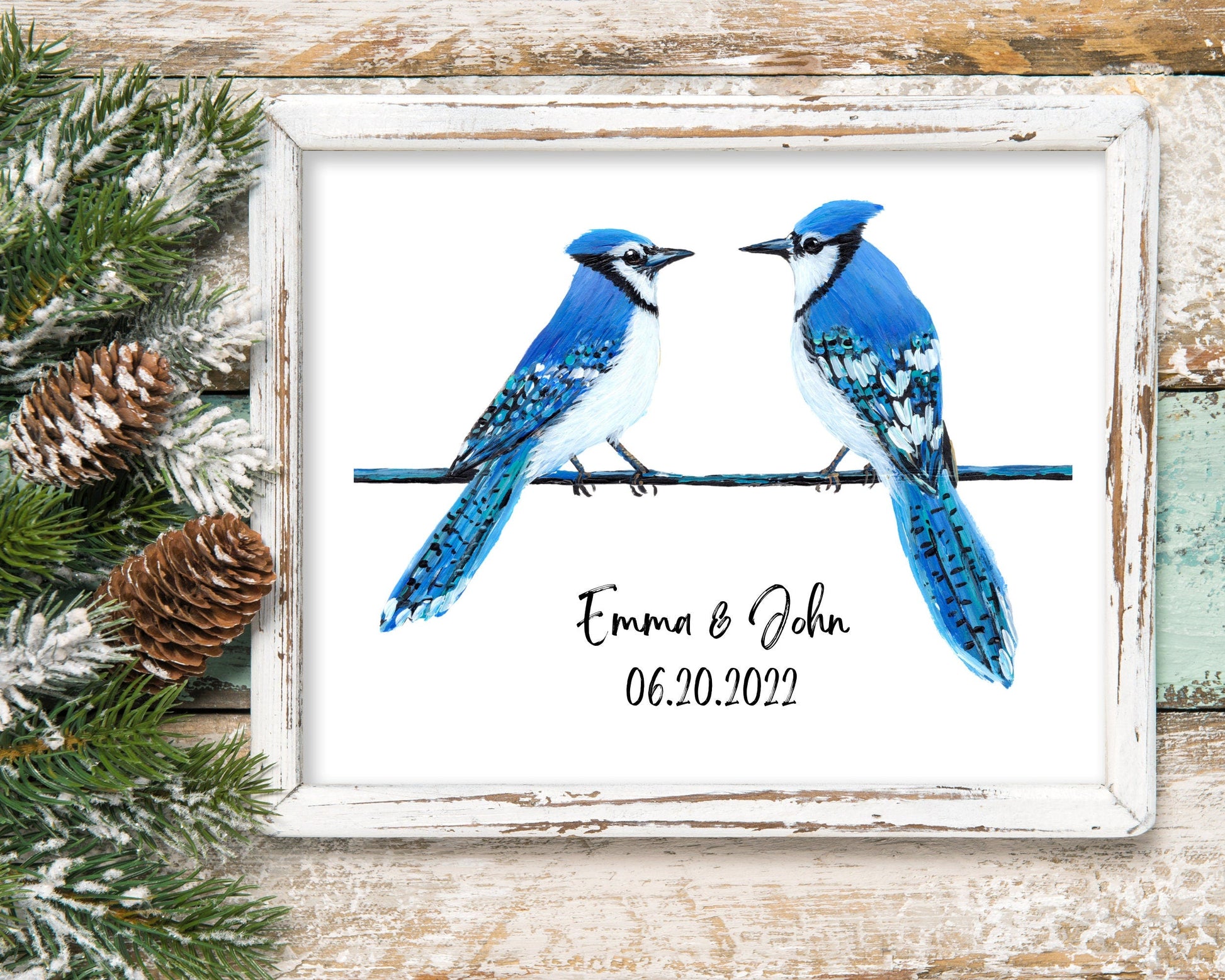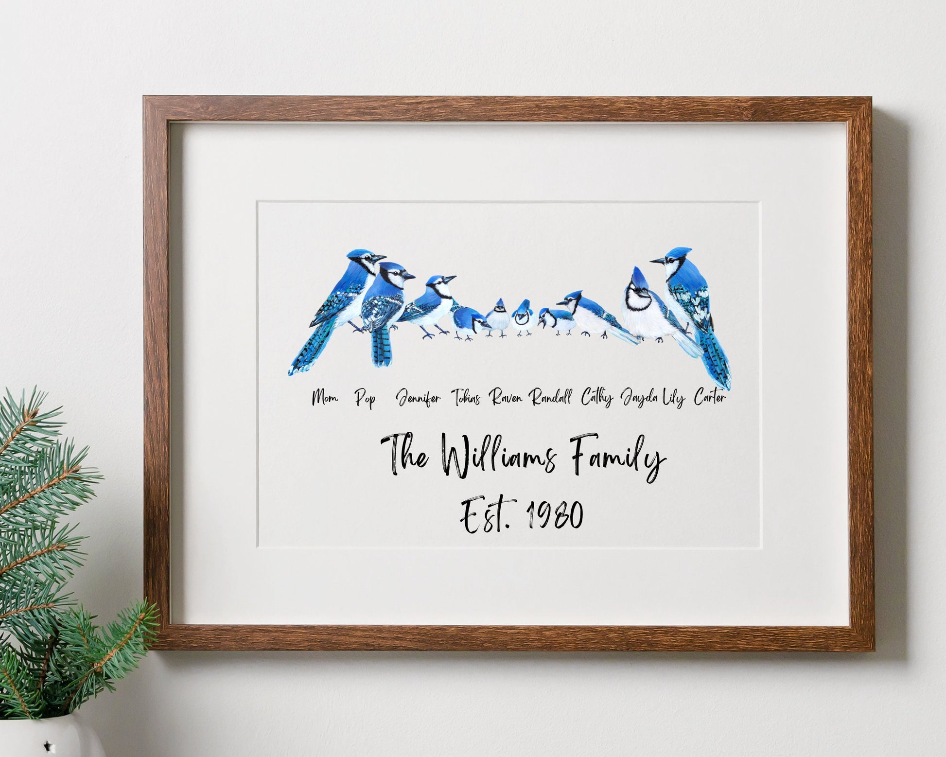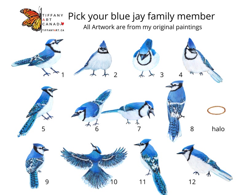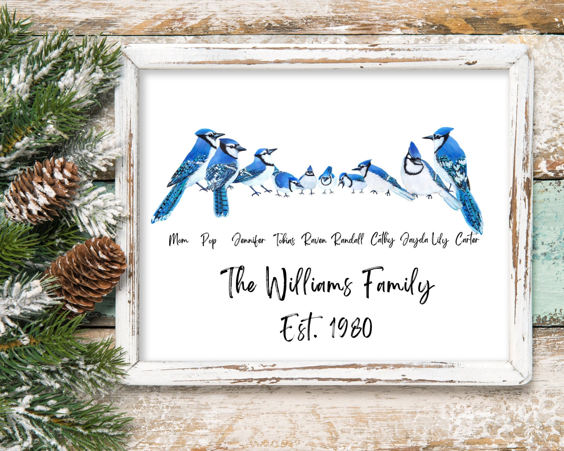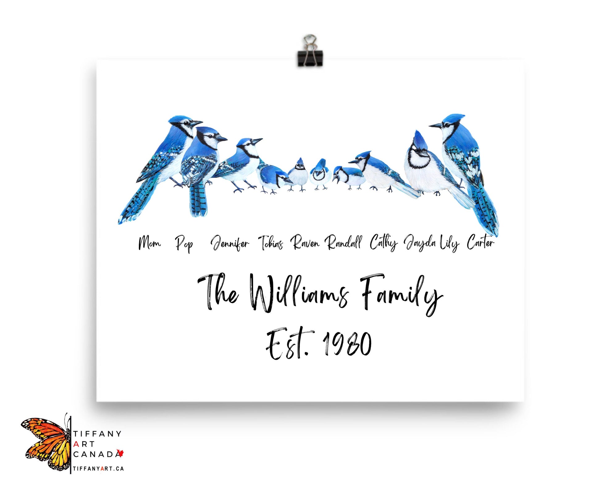 Personalized blue jay family prints are the perfect gift for any occasion. These family portraits are made from original paintings. It is easy to customize your animal print by adding a name or text of your choice. Great for Mother’s Day, Dad’s Day, Grandparents, Birthday Gifts, or any occasion!